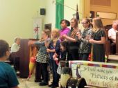 People were invited to come to worship dressed casually in what you might wear to go fishing. (If you go fishing at the grocery store, you can wear the casual clothes in which you go shopping). The sanctuary was decorated with fishing related items, including fishing poles, tackle boxes, creels, and buoys. Our Junior Choir sang, "Fishers of Men." Fishing jokes were told, an assortment of cartoons were placed throughout the bulletin, and uplifting music was sung.