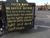 Those who are fans of Star Wars will probably understand why a battle between Darth Vader and Anakin is a battle within. If you are not sure, we invite you to ask. More importantly, we invite you to come and share in the faith at St. Paul's UCC where we help all choose God's light in the battle against the darkness.