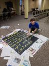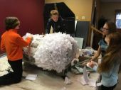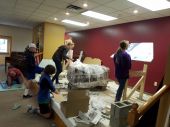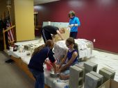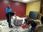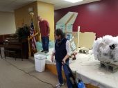 Below are the pictures from the process of building the float. Our youth group designed this year's float and banners. Over the course of a few weeks, we had six teens/tweens and 13 adults working together to help build the float over the course of about 30 hours, for a total of 19 people helping with the construction. In the parade we had nine youth and six adults walking or riding, for a total of 15 parade participants, giving us a total of 24 people who participated in the parade and/or helped with the construction of the float.